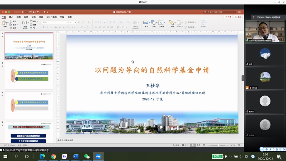 邀请了华中科技大学同济医学院附属同济医院胃肠外科中心医学博士、国家自然科学基金优秀青年基金获得者王桂华教授在线作了“以问题为导向的自然科学基金申请”专题报告会。王桂华教授结合自己的申报和评审经验,从国基金申报的总体策略和具体细节两个层面、从申请人和评审专家两个角度详细讲解了国基金申报中的一些共性问题和个性问题,提出了一些针对性很强的建议,并对老师们提出的问题进行了耐心解答。相信通过本次报告会,对于台湾色情
