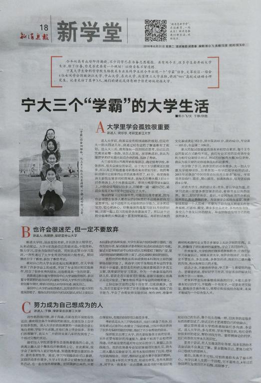 生物技术专业本科毕业班今年出现一个“学霸”宿舍,文萃校区一宿舍4位女同学分别被浙江大学、中山大学、东北大学、北京理工大学录取,将到“985”高校攻读硕士研究生。记者采访了其中3人,她们的讲述或许有助于你更好地迎接大学。
