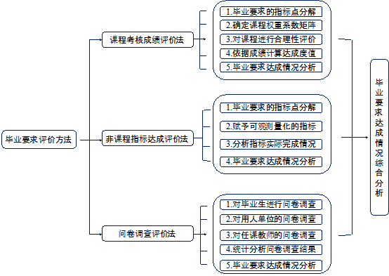 根据毕业要求各指标点设计量表测评问卷,计算毕业要求达成情况。本专业毕业要求达成情况值取基于人数的加权平均值。毕业要求达成情况由该毕业要求中指标点达成情况最低的一项决定。