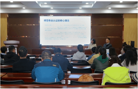 于文萃校区知本楼二楼报告厅召开师范专业认证动员会。院党委书记李东宁、院长苏建宇出席会议,各教研室负责人、课程负责人、参加师范专业认证的教师参加会议,会议由副院长李乐主持。